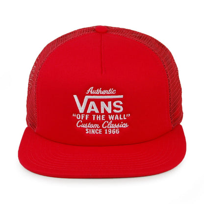 Voici la Casquette Trucker Galer de chez VANS en rouge. Cette casquette est ornée du logo Vans ainsi que du célèbre slogan "Off The Wall" brodés à l'avant de la calotte. Cette casquette possède des pans arrière en maille pour une meilleure aération et une étiquette Vans est cousue à côté du snap ajustable à l'arrière.