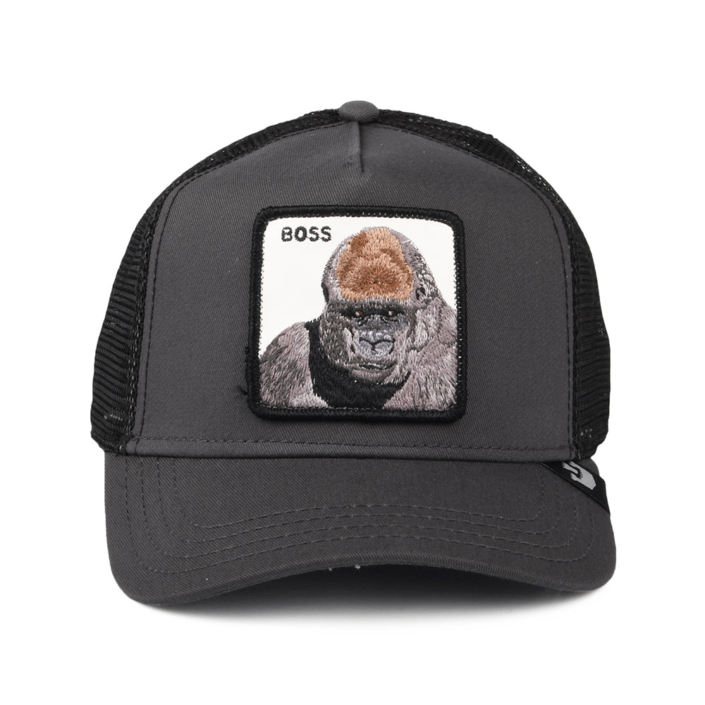 La Casquette Trucker Primal de chez Goorin Brothers en gris est une casquette de baseball qui arbore un patch avec un gorille, brodé sur les pans avant structurés en coton. Les pans arrières de la casquette sont, quant à eux, en maille polyester. Enfin, une étiquette Goorin est cousue sur le côté gauche de la visière incurvée.