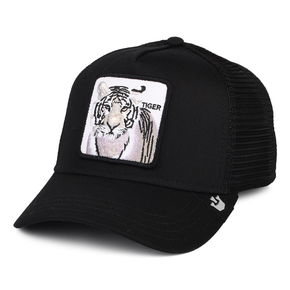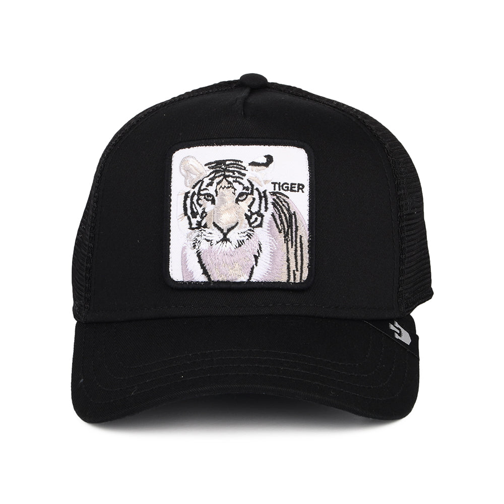 La Casquette Trucker White Tiger de chez Goorin Brothers en noir est une casquette de baseball en coton dont les pans arrière sont en maille polyester. Cette casquette arbore un patch personnalisé sur lequel est brodé un tigre blanc. Une étiquette Goorin est cousue sur le côté gauche de la visière incurvée. Enfin, un snap permet d'ajuster la casquette confortablement.
