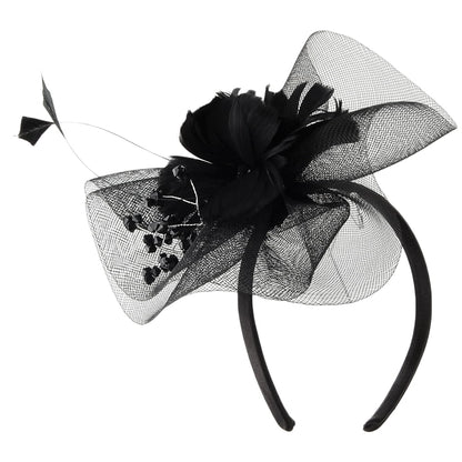 Voici le Chapeau Bibi Clementine en noir de chez JANE ANNE DESIGNS. Ce joli chapeau bibi présente un voile et des plumes avec strass décoratifs. Ce chapeau bibi a un serre-tête de maintiens qui convient à la majorité des tailles.
