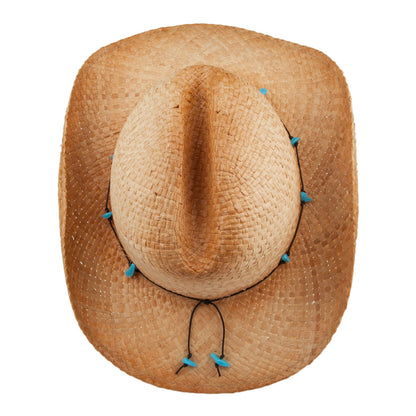 Le chapeau de cowboy Calamity Cattleman de chez Sur La Tête est un fantastique chapeau en paille du Far Ouest, l'un de ceux que vous pourrez porter avec une paire de bottes. La paille de raphia légère a été brunie afin de donner à ce chapeau ce colori ocre chaleureux. La calotte du chapeau est joliment ornée de fausses pierres turquoises attachées sur une cordelette cirée. L'extrémité du bord du chapeau comporte une tige de fer qui permet de modeler le bord au gré de vos envies. Enfin, ce chapeau possède un bandeau intérieur élastique.