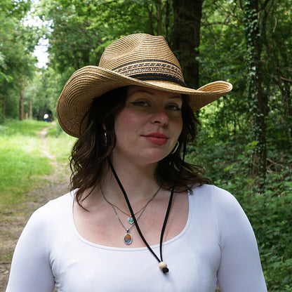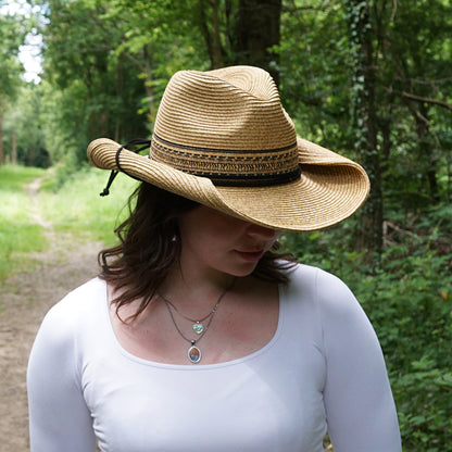Voici le chapeau de cowboy Santa Fe de chez Jaxon & James couleur toast. Ce chapeau en paille toyo très typé western avec son bord aux courbures marquées (modelables) est sans conteste une valeure sûre ! Le chapeau est orné de pailles noires tressées dans la calotte en lieu et place d'un bandeau extérieur. Une jugulaire permet au chapeau de rester bien en place sur la tête et un cordon ajustable permet au chapeau de s'ajuster comfortablement à plusieurs tailles.