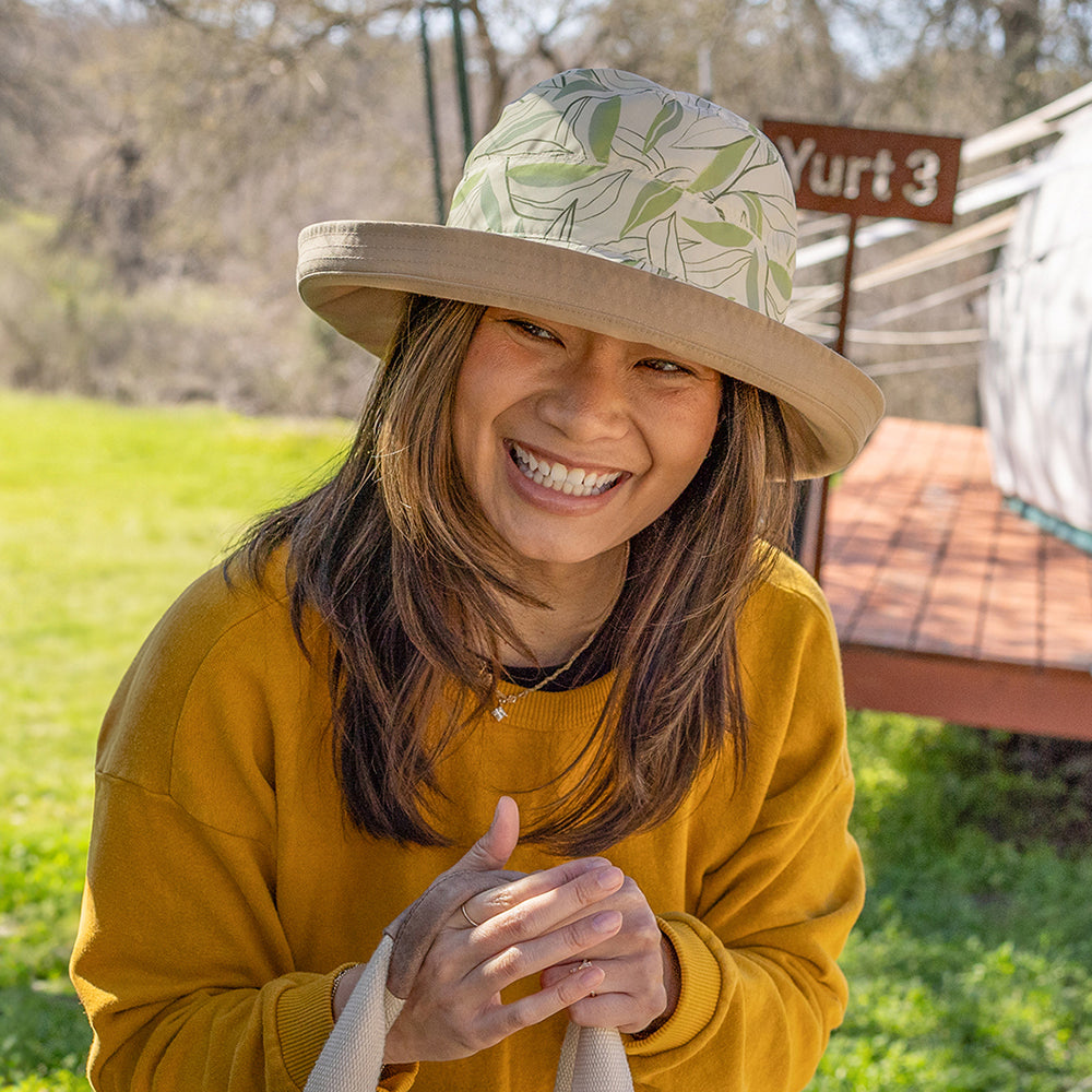 Voici le Chapeau Été Réversible Natural Blend Kettle en marron clair-multi de chez SUNDAY AFTERNOONS. Le chapeau présente un tissu en coton naturel et polyester recyclé du côté uni et un polyester entièrement recyclé du côté avec un imprimé feuilles. Avec un indice de protection solaire UPF 50+ et une finition hydrofuge durable sans PFAS, ce chapeau été vous protégera contre les éléments, la pluie ou le soleil.