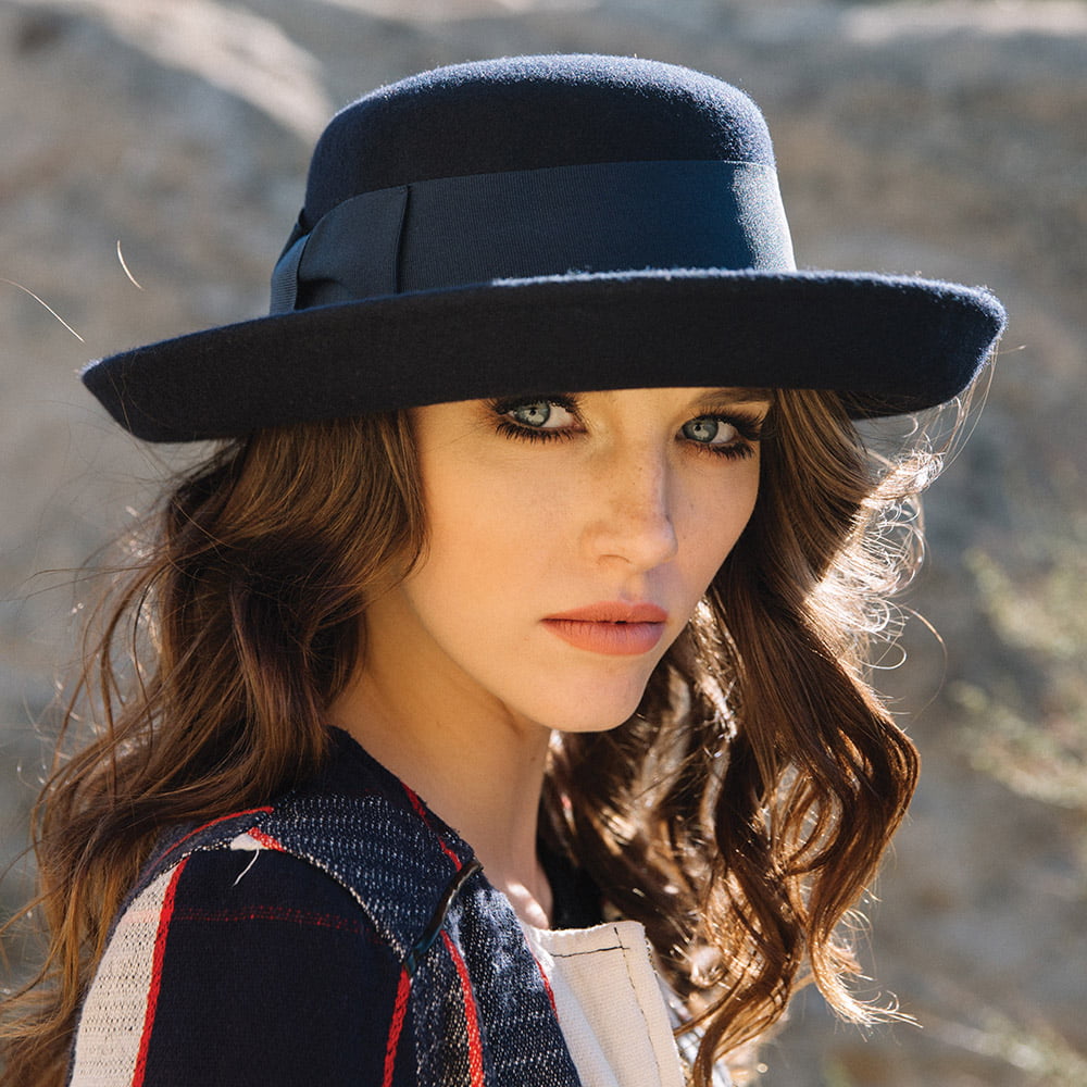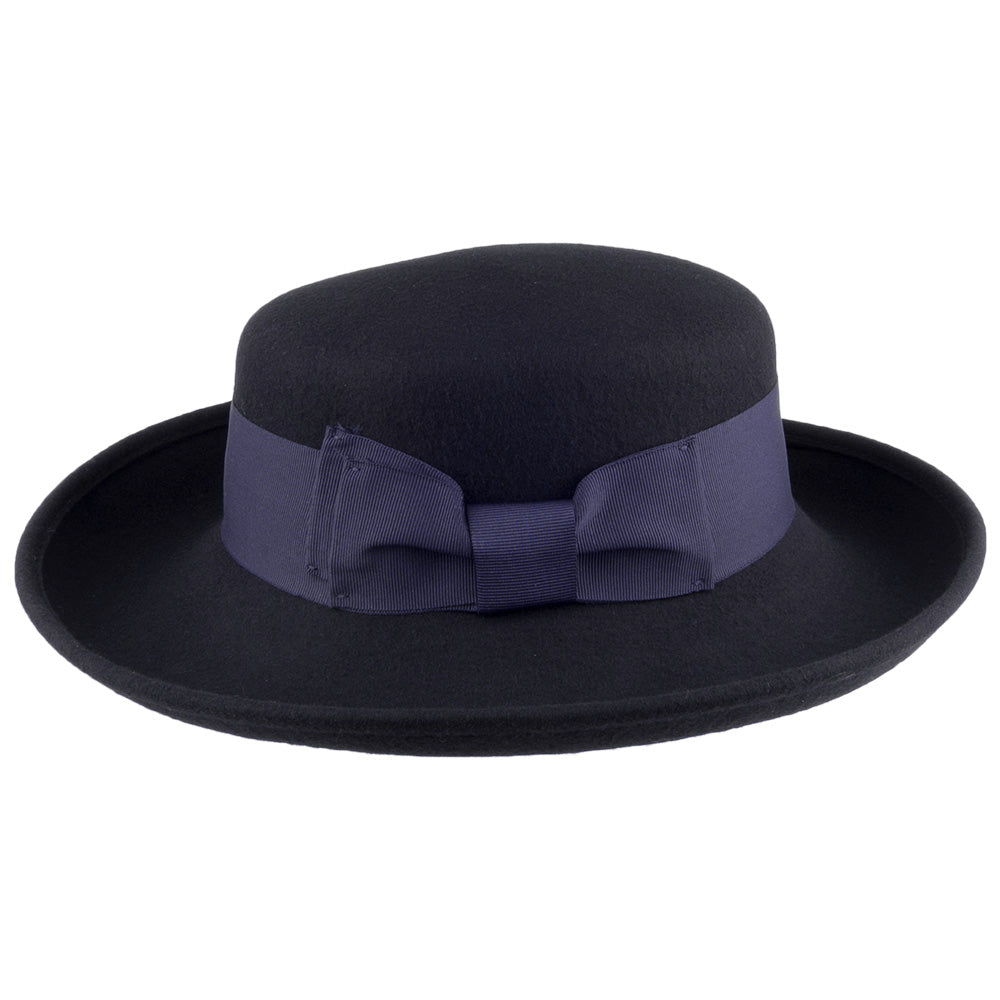 Voici le chapeau Kettle en Laine Feutrée Blossom SCALA en bleu marine. Ce chapeau fait à 100% Laine feutrée possède un bandeau intérieur en gros-grain et un bandeau extrérieur de la même matière fini d'un noeud sur le côté. Le chapeau est également doté d'une calotte basse et d'un bord incurvé. Ce chapeau serait une parfaite addition à n'importe quelle garde-robe !