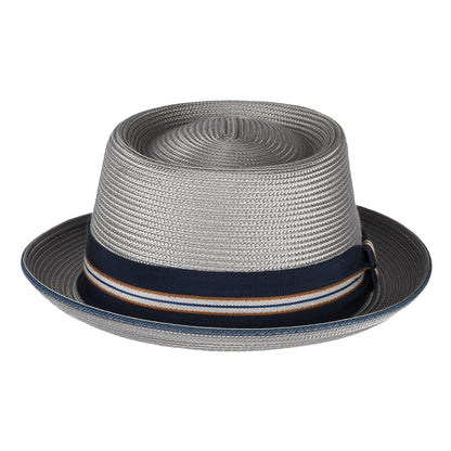 Voici le très élégant chapeau Pork Pie Carver de chez Bailey en gris. Ce chapeau non doublé est le parfait accessoire pour l'été. Ce chapeau conserve toutes les caractéristiques du chapeau Pork Pie classique avec un large bandeau extérieur à rayures dont le côté gauche est orné d’un nœud surmonté d'un insigne Bailey cousu. Pour plus de confort, le chapeau possède aussi un bandeau intérieur en coton.