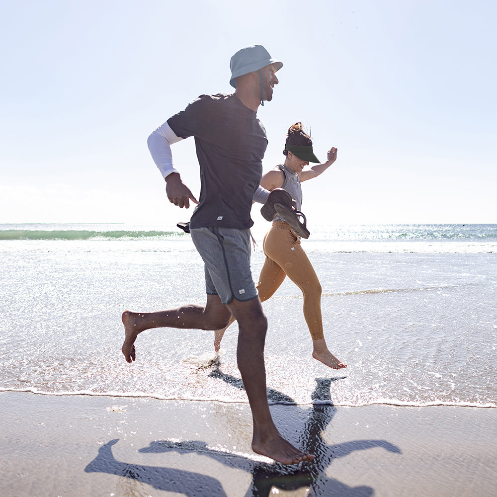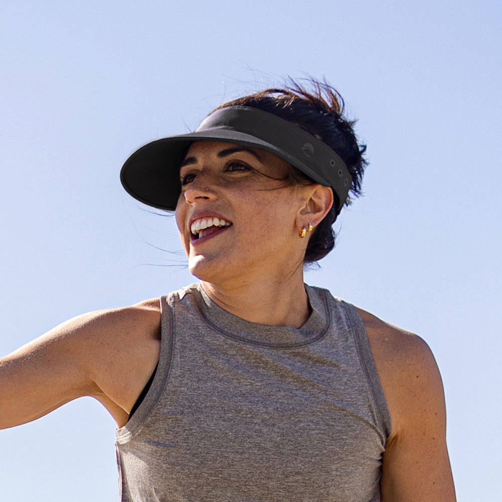 Voici la visière Sunward en noir de chez SUNDAY AFTERNOONS. Un indice de protection solaire IP 50+, un bandeau intérieur ajustable anti-sudation, un traitement hydrofuge (sans PFAS), pour rester bien au sec et une longueur d'environ 9cm en fait un chapeau parfait pour les journées ensoleillées. Une visière idéale pour voyager et bronzer sous le soleil mais aussi pour rester visibles de nuit avec ses détails réfléchissants.